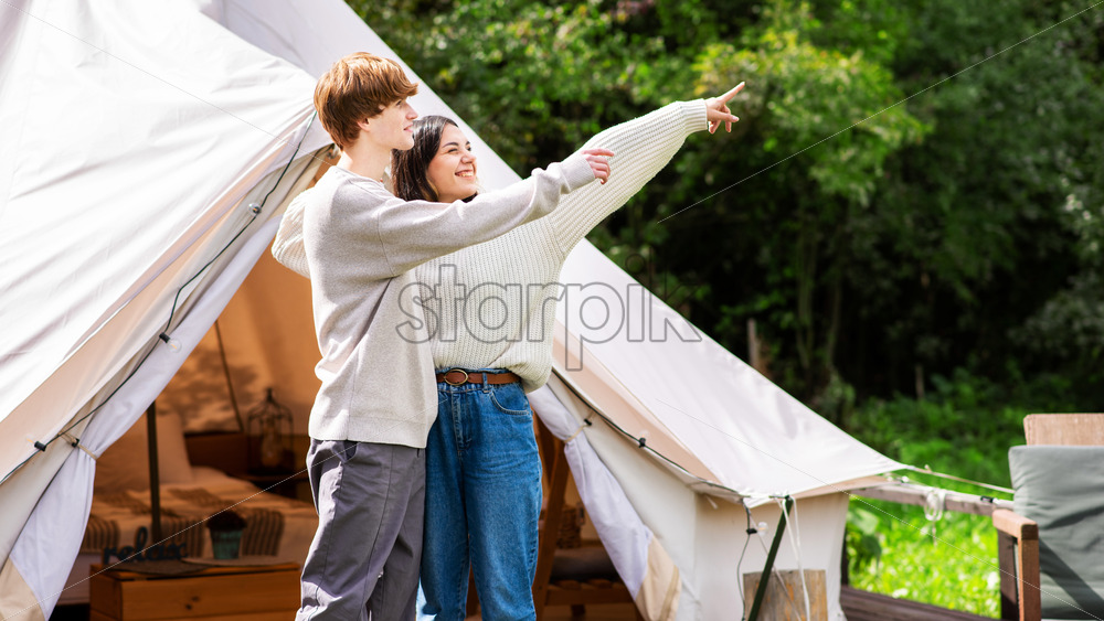 A couple hugging each other and talking on a tent terrace at glamping. Lush forest around