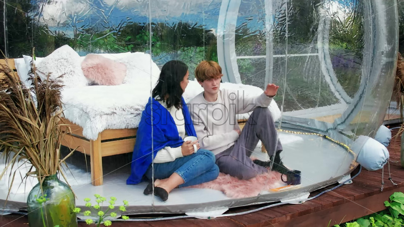 A couple sitting inside a transparent bubble tent at glamping. Sitting under a blanket, holding cups and talking. Lush forest on the background