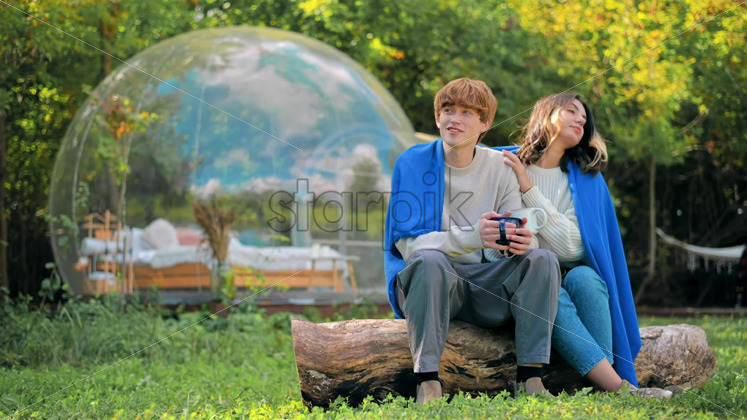 A couple sitting under a blanket on a stump, holding cups and talking at glamping. Tents on the background, lush forest around