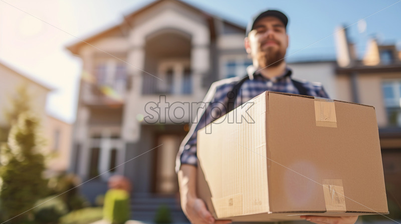 CHISINAU, MOLDOVA – DECEMBER 22, 2020: Glovo delivery man with yellow backpack and client holding the order, opened door
