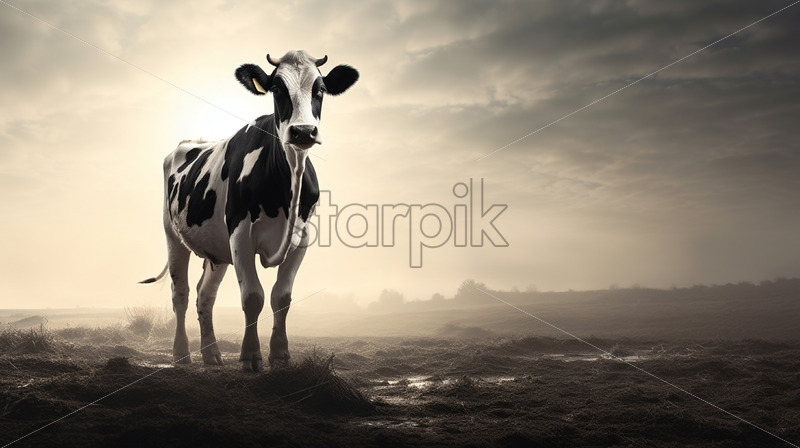A cow on a pasture in black and white colors