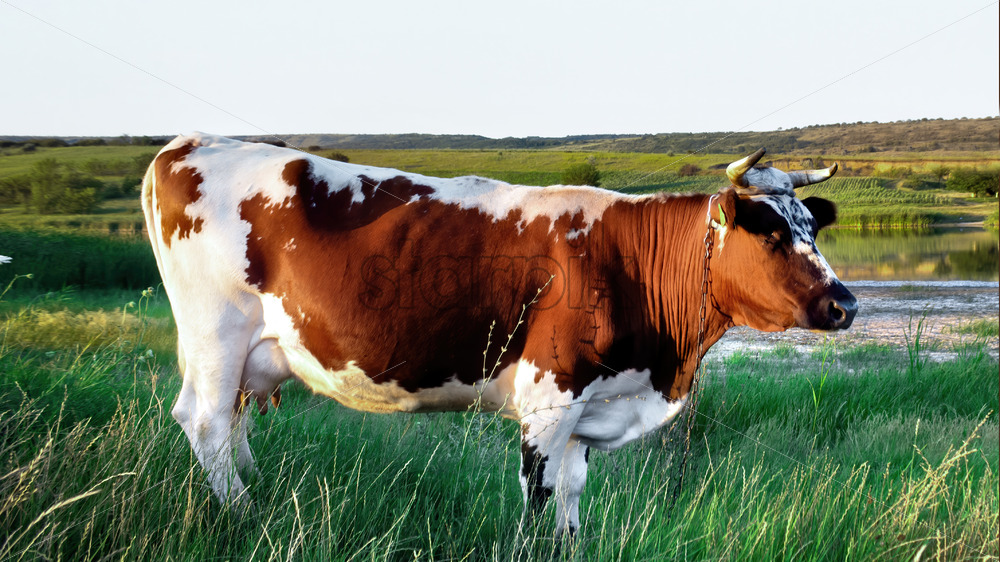 A cow staying in the grass with chain on the neck, water, fields and hills on the background in Moldova