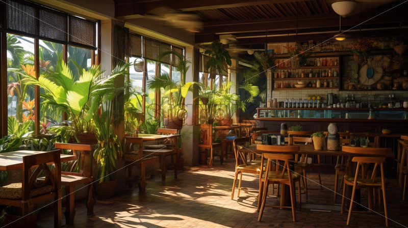 A captivating photo capturing the inviting glow of a roadside coffee shop during dusk, adorned with warm lights, featuring wooden chairs and tables outside, complemented by hanging plants for a cozy and atmospheric outdoor setting.