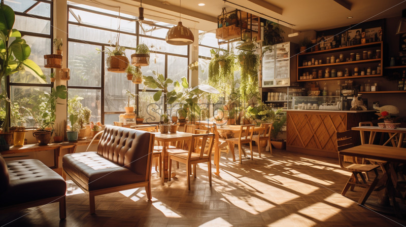 A charming photo capturing the warmth of a coffee shop bathed in warm lights during dusk, taken from outside, featuring wooden chairs and tables adorned with hanging plants, creating a cozy and inviting atmosphere.