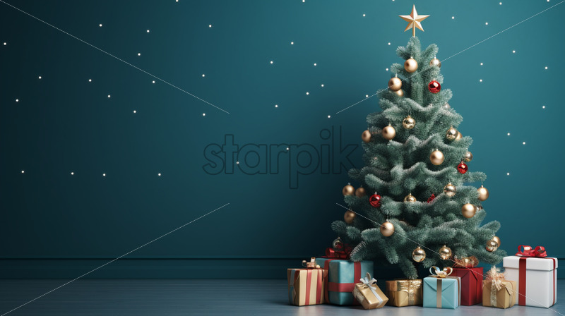 A decorated Christmas tree against the background of a dark blue wall