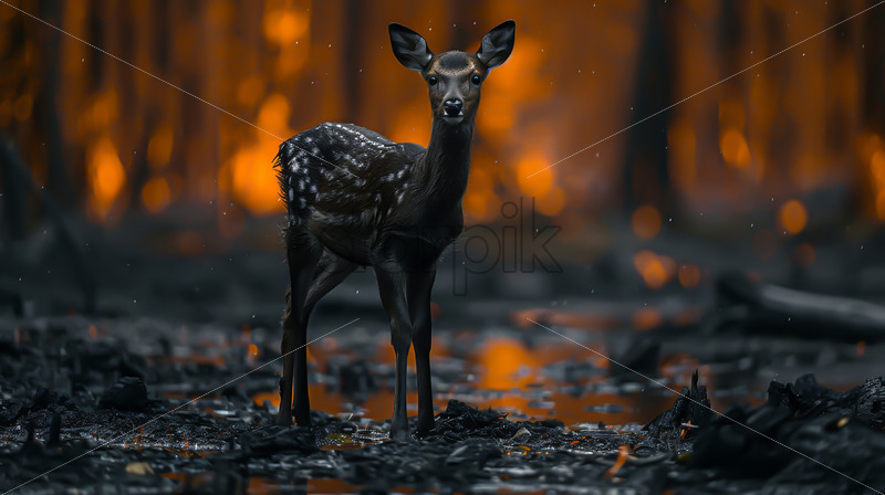 A deer in the burning forest