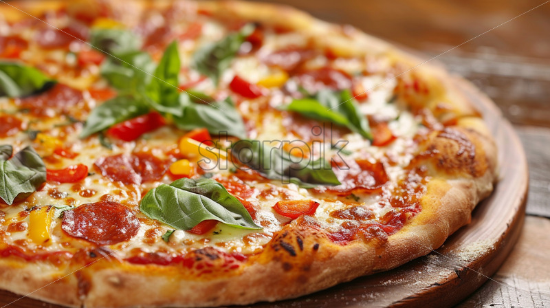 A delicious pizza on a wooden top
