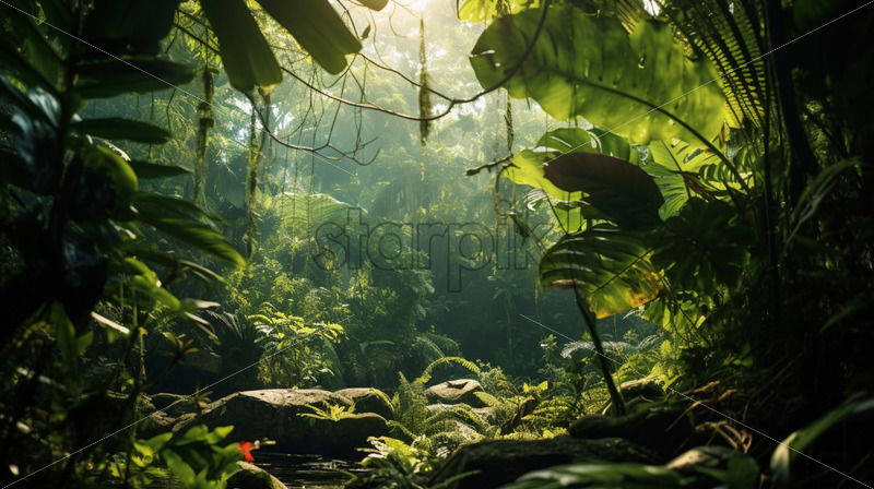 Home » Shop » Uncategorised » A dense jungle canopy with vibrant and varied flora, hiding mysterious creatures within its shadows