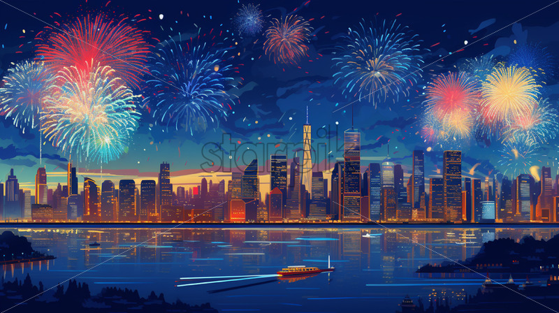 Home » Shop » Uncategorised » A digital illustration of a city with fireworks