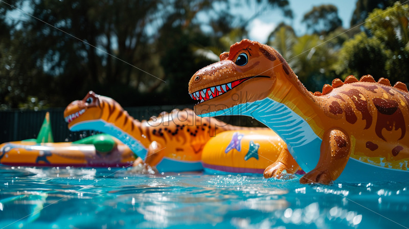A jungle adventure pool party with animal-themed decorations and kids in safari outfits