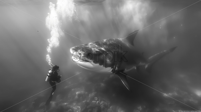 A diver face to face with a huge shark