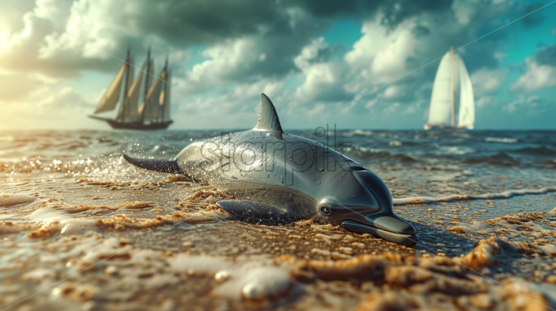 Cannes, France – October 4, 2025: Metal dolphin sculpture filled with plastic waste displayed on a sandy beach by the sea, raising awareness about ocean pollution Royalty Free Stock Video Footage