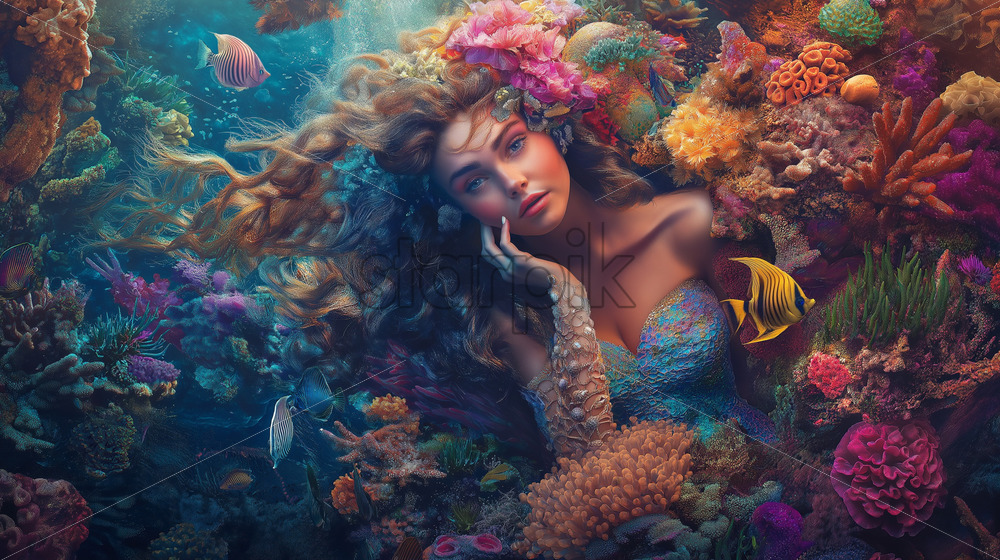 A dreamy vibrant underwater world with mermaids, coral reefs