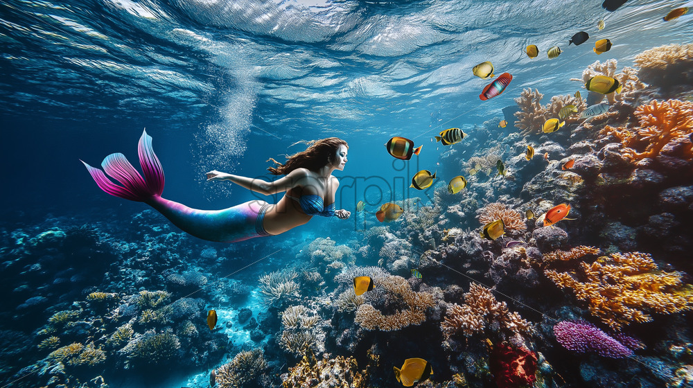 Home » Shop » AI Illustration » A dreamy vibrant underwater world with mermaids, coral reefs