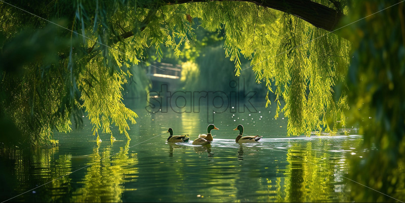 A family of ducks gliding peacefully across a serene pond framed by weeping willows