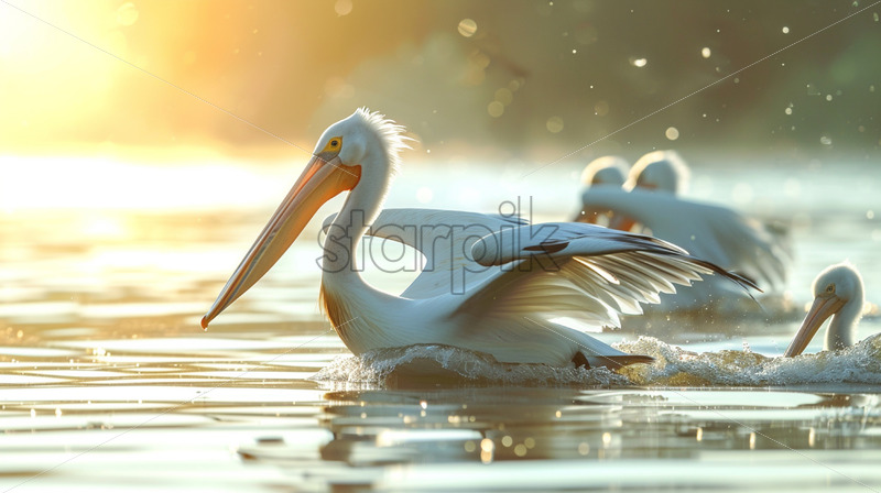 A family of pelicans gliding gracefully above the water’s surface