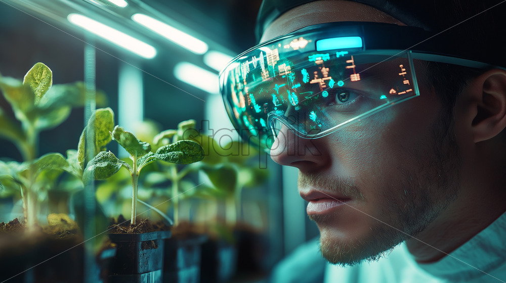 Home » Shop » AI Illustration » A farmer wearing augmented reality glasses, observing plants