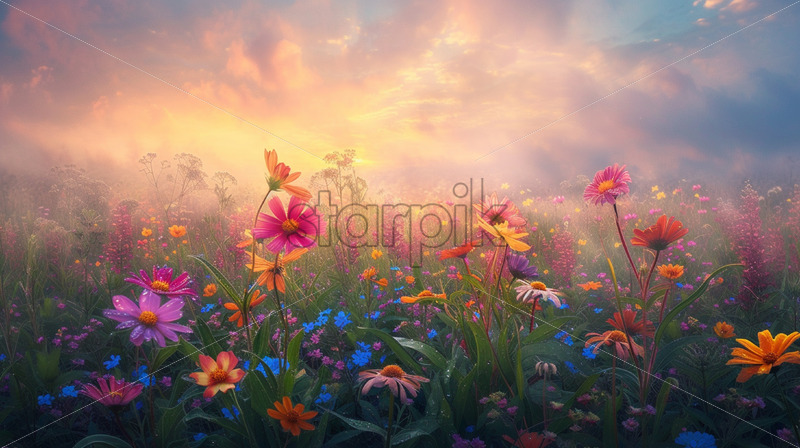 A field full of flowers at sunrise, the fog in the distance