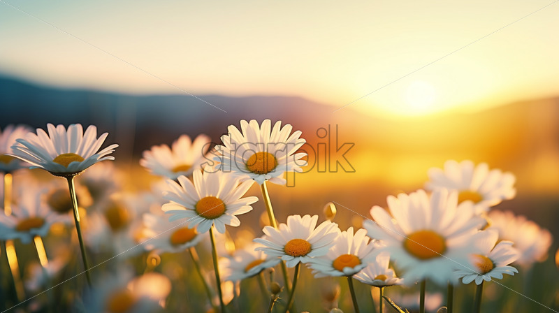 View of sunset. Orange sky, landing plane, buildings, stars, greenery