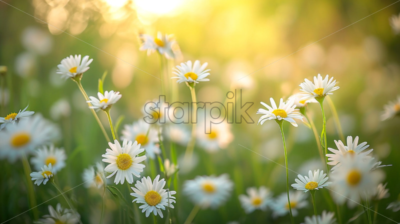 A field of daisies swaying in unison as a gentle breeze sweeps through