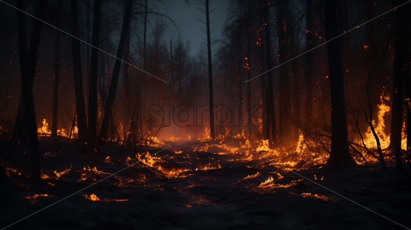 Aerial drone view of the consequences of fires in Greece. Burned vegetation, ash and coal