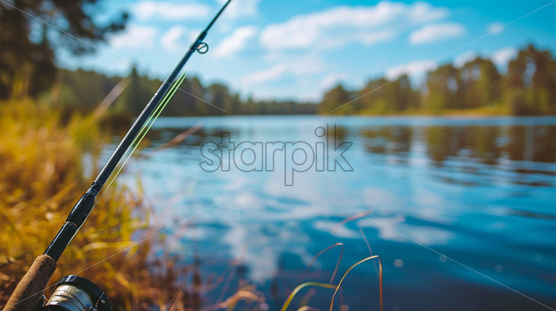 Asian 50 years old fisherman holding a fishing rod on a lake