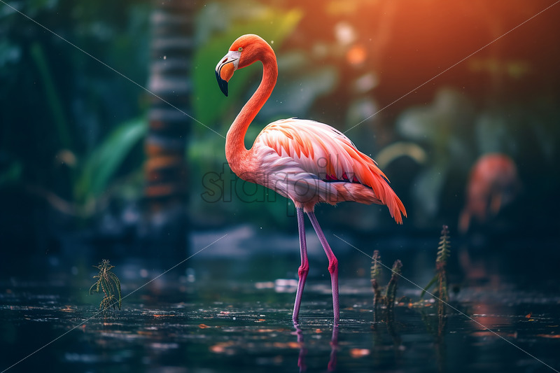 Home » Shop » Uncategorised » A flamingo walking through the water of a lake in a tropical forest