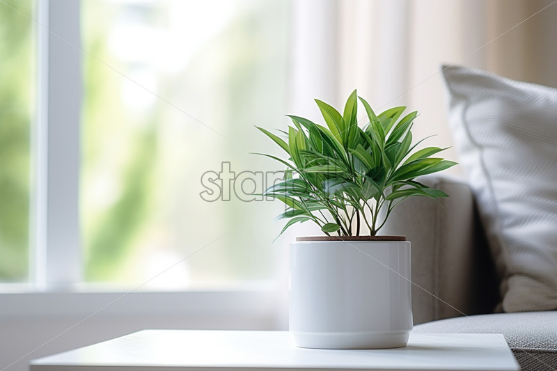 A flower in a white pot on a table in the living room