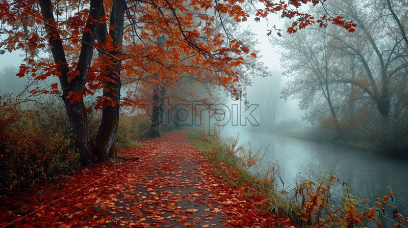 A forest with red autumn leaves and a river in the fog
