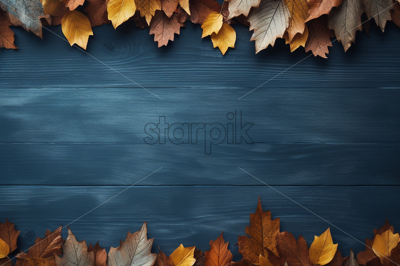 A frame of dry leaves formed on a blue wooden table