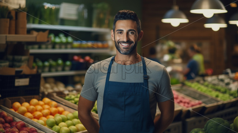 A fruit and vegetable seller, with a smile on his face