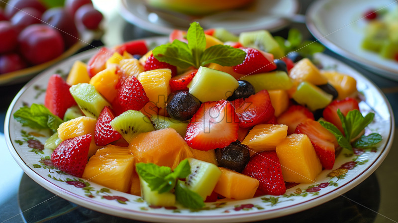 A fruit salad on a platea