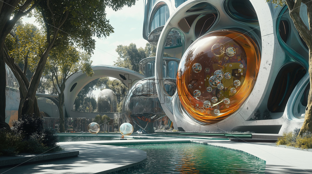 A concept art of a solar-powered quantum irrigation system, distributing water through glowing pipelines