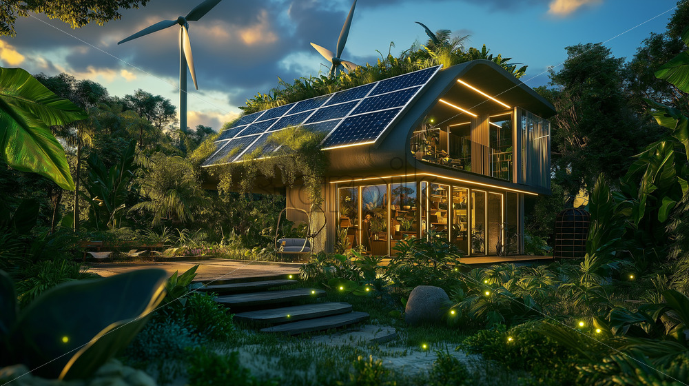 A futuristic eco-home surrounded by lush greenery, featuring solar panels, wind turbines
