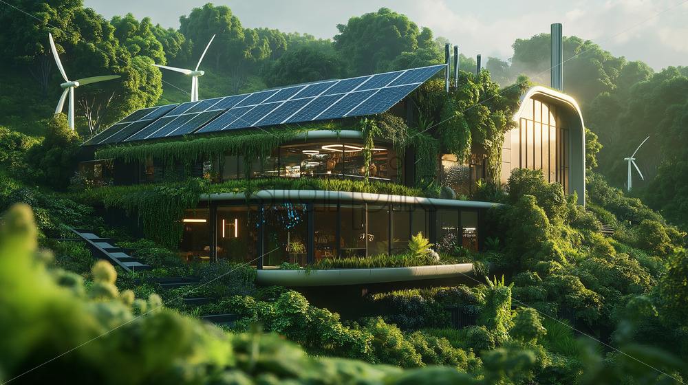 A futuristic eco-home surrounded by lush greenery, featuring solar panels, wind turbines