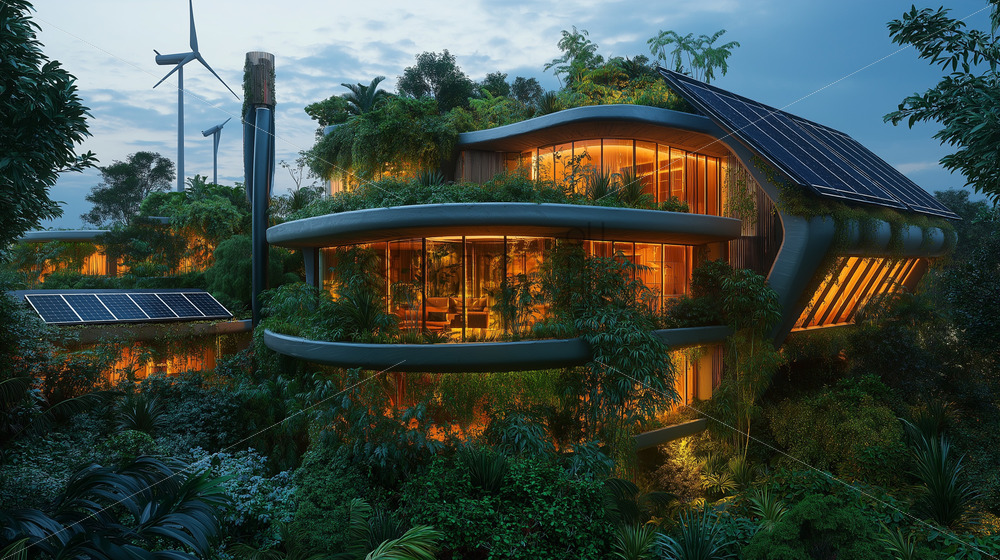 A futuristic eco-home surrounded by lush greenery, featuring solar panels, wind turbines