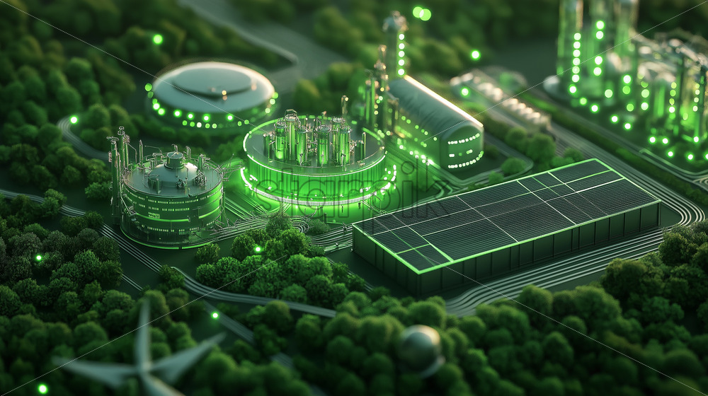 A futuristic green hydrogen plant powered by solar panels and wind turbines