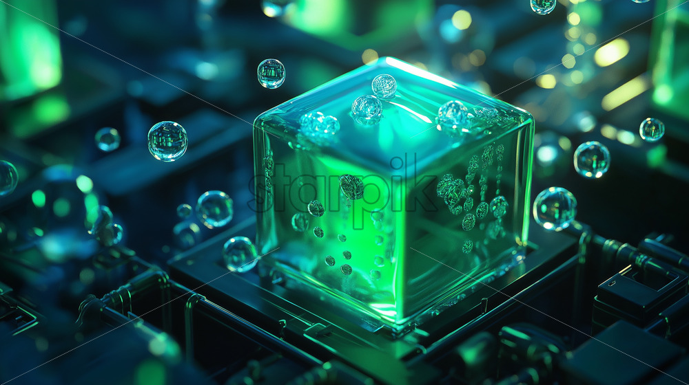 Home » Shop » AI Illustration » A futuristic hydrogen fuel cell depicted as a glowing cube