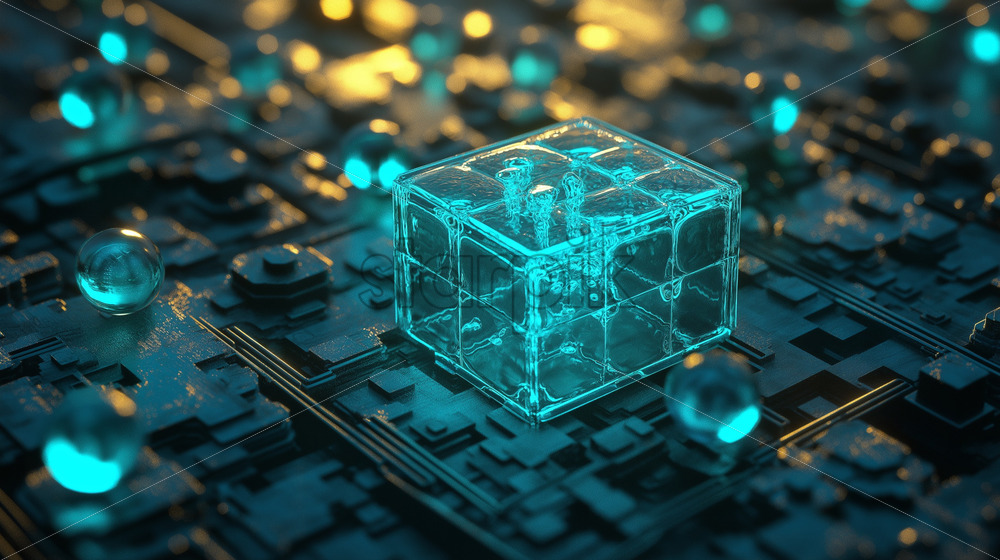 Home » Shop » AI Illustration » A futuristic hydrogen fuel cell depicted as a glowing cube