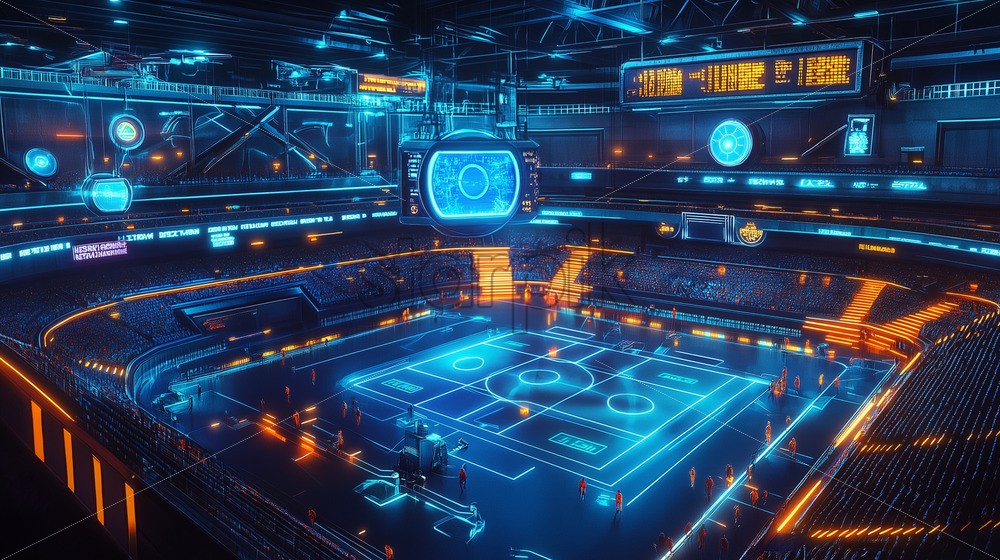a futuristic sports arena with holographic scoreboards, drone referees, and spectators