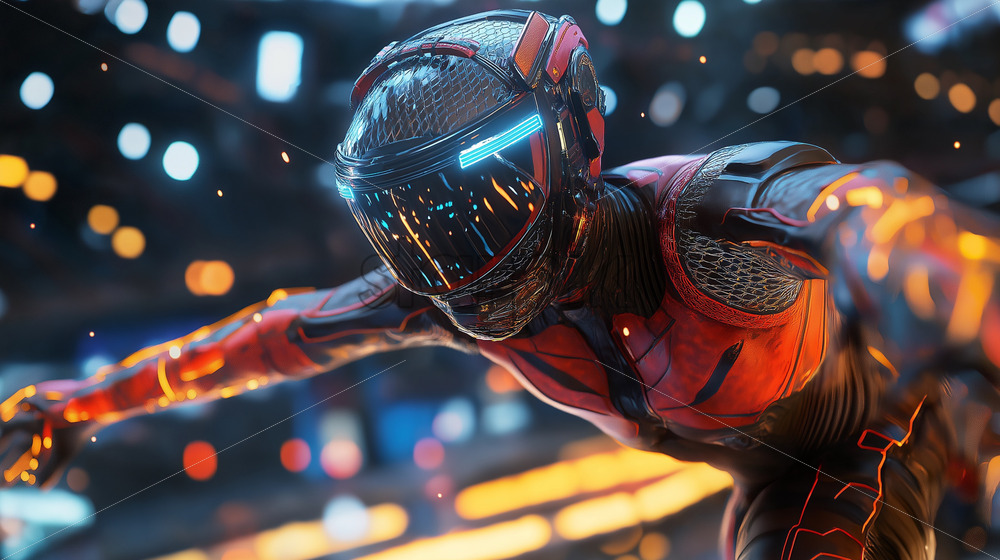A gamer participating in virtual sports tournament, wearing a futuristic VR