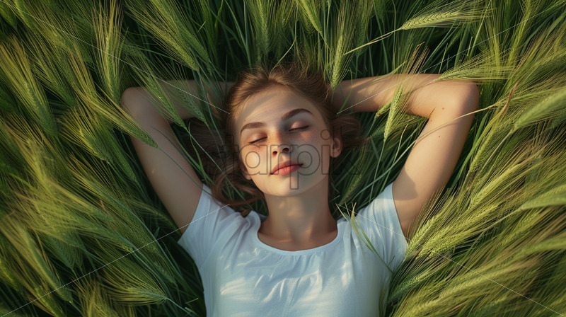 A girl in a field with green wheat, top view