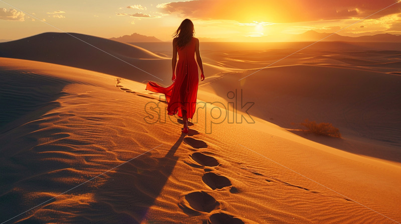 A girl in a red dress in the desert