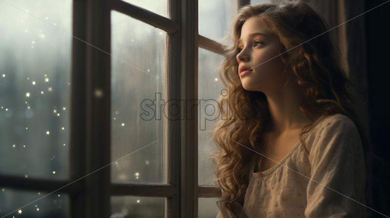 Close-up shot of a young caucasian girl with curly long dark brown hair and bangs. Freckles on the face. Expressing tenderness. Isolated background