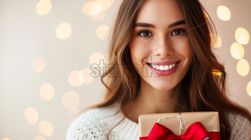 A girl with a gift in her hand on a light background