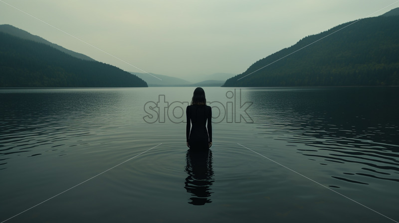 Portrait of gorgeous and beautiful caucasian woman in casual clothes looking at extensive landscape and standing on the observation deck with high mountains bordering with expanse of water in the background. Lake Como, Italy