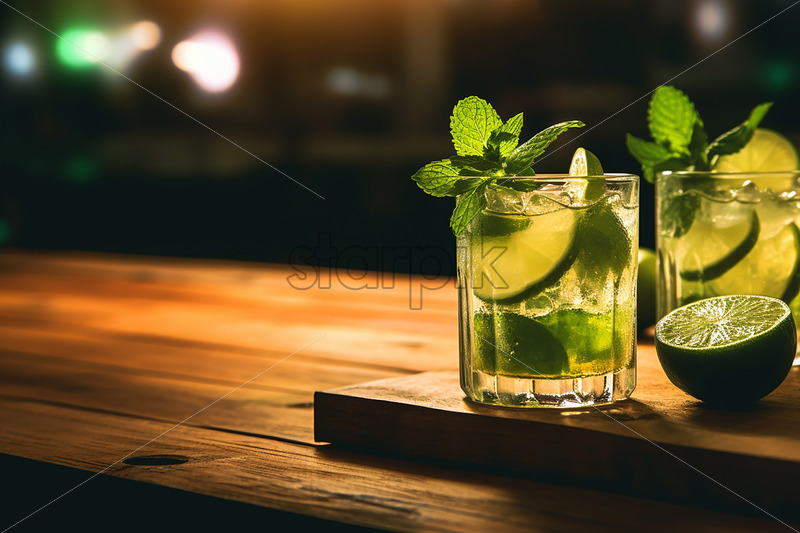 Drinking lemonade cocktail glasses with straw and ice shaking, man and woman friend hands cheers at an event with blurred red hair people and colored wall background