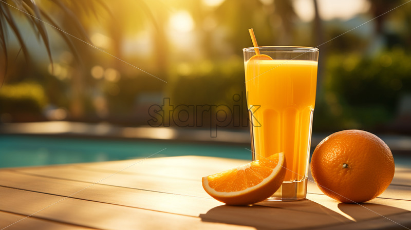 Home » Shop » AI Illustration » A glass of orange juice on the background of a swimming pool