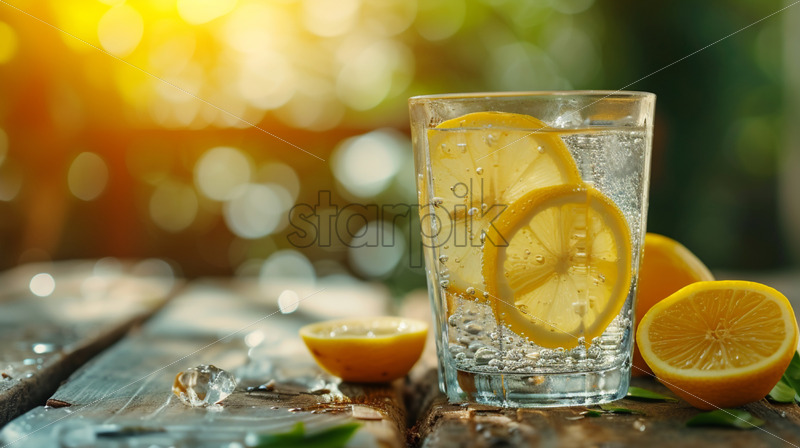Home » Shop » Uncategorised » A glass of water with lemon slices on a wooden table
