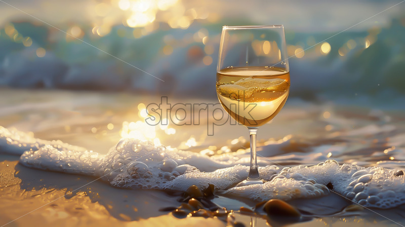 A glass of white wine on a beach